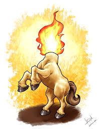 cabeça no lugar apenas fogo; possui em seus cascos ferraduras que podem ser de